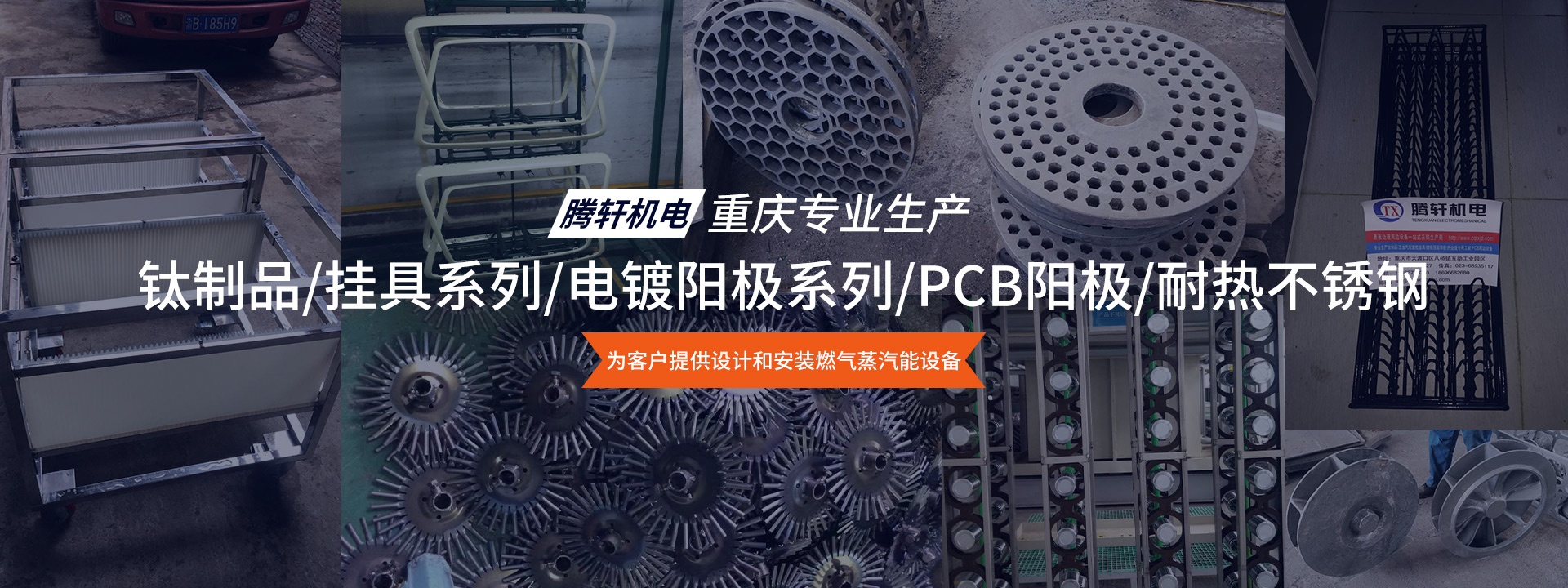 重慶騰軒機電設備有限公司專業生產鈦制品(鈦籃、鈦管、鈦掛具、鈦碟、鈦電加熱管、石英加熱管、聚四氟乙烯加熱管、聚四氟乙烯換熱器、鈦靶材、鈦螺絲、鈦爪、鈦錫爐、鈦藍袋),掛具系列(電鍍五金掛具、汽配塑膠掛具、電泳掛具),電鍍陽極系列(鍍銘專用高密度壓延陽極棒、壓延陽極桶、菊型、梅花型、粗化電解板、壓延錫板),PCB系列(PCB包膠掛具、快速夾仔、掛籃、沉銅金籃、插板架、熱壓轆、膠齒輪、膠錕、耐酸喊泵、UV燈、PCB電鍍生產線舊線改造和維護保養工程),耐熱不銹鋼(料盤、料框、料架、網帶、導軌、輻射管、電爐絲),為廣大客戶提供設計和安裝燃氣蒸汽能設備。...